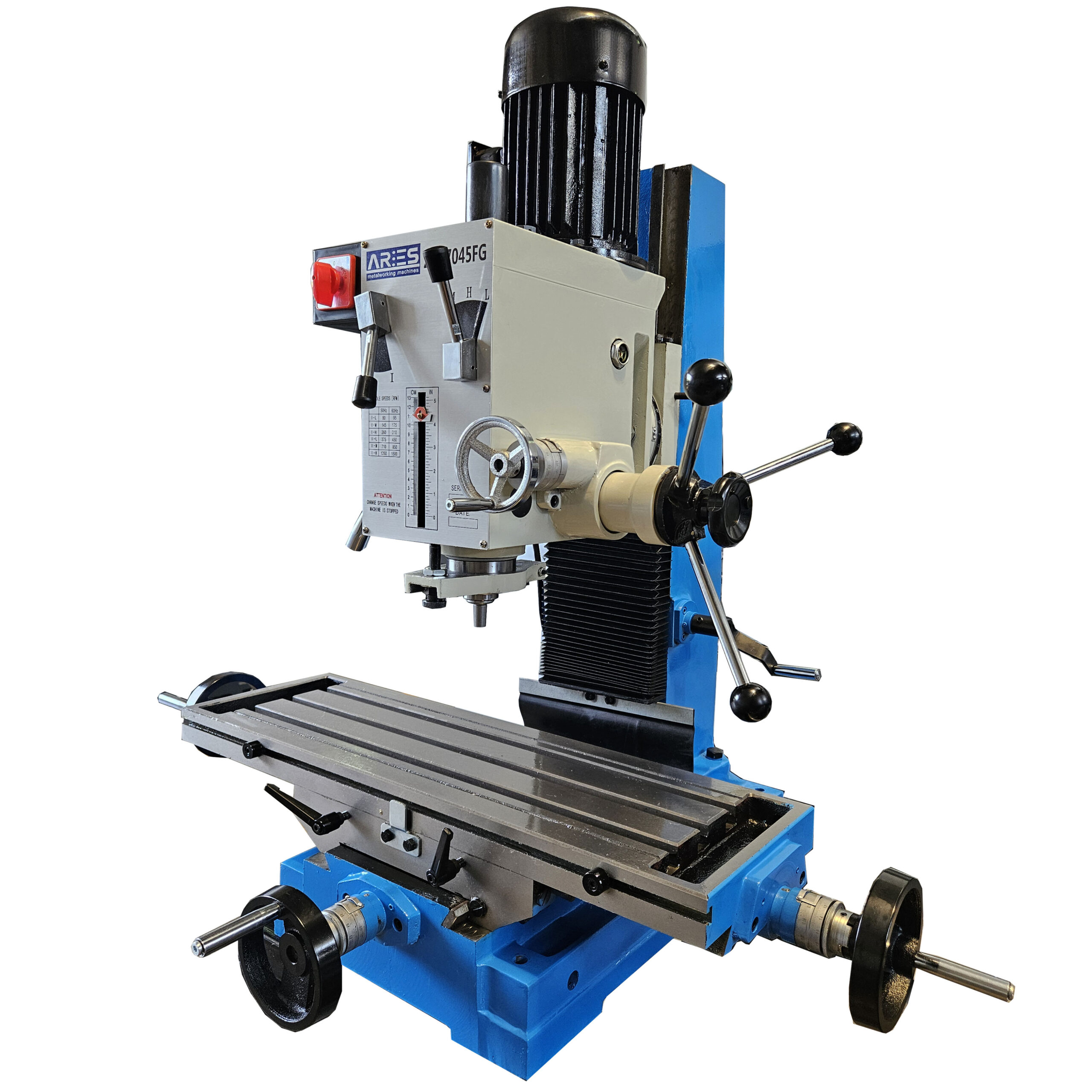 Taladro Fresador ZAY7045FG: versátil en el maquinado de piezas metálicas pequeñas. Cabezal engranado, guías de cola de milano, cono R8, mesa 9.6”x32”, motor 2hp.